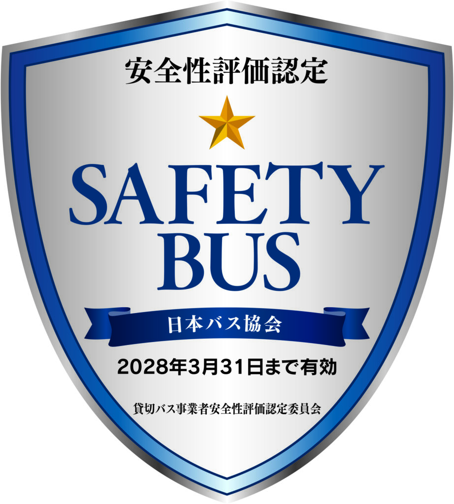 貸切バス事業者安全性評価認定制度 2025年12月24日に 貸切バス事業者安全性評価認定委員会様より 1つ星 の評価を頂きました。 日々お客様の安全と交通安全を最優先し、業務を邁進して参りたいと思います。 各位にはこれまで以上のご愛顧の程お願い申し上げます。
